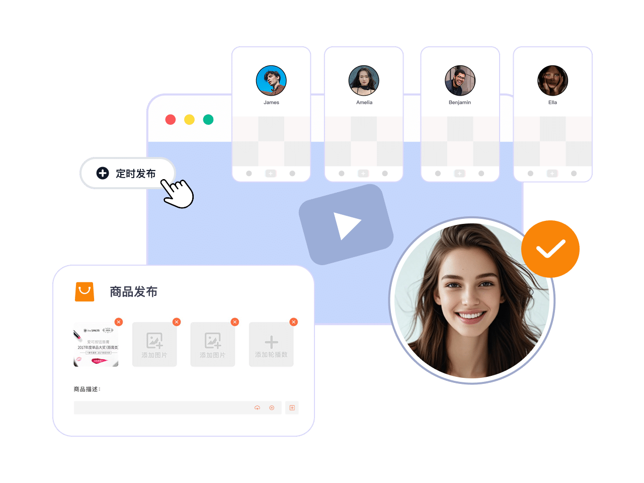 •支持批量随机发布、1v1精准发布、定时/多频次发布等不同发布策略,精准适配场景需求; • 支持视频内容随机或指定商品挂车发布,满足用户多种变现需求。